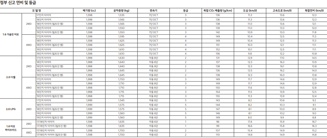 | 1.6 가솔린 터보 | 12.3 | 2WD/17인치 타이어 |