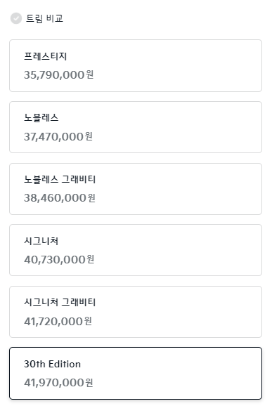 트림은 가장 기본인 프레스티지 그 다음으로 노블레스, 노블래스 그래비티, 시그니처, 30주년 에디션 순으로 높아집니다. 표에는 대표트림 3가지와 3주년 에디션 스페셜 트림의 가격을 보기 쉽게 정리하였습니다.