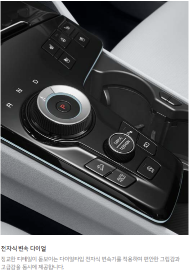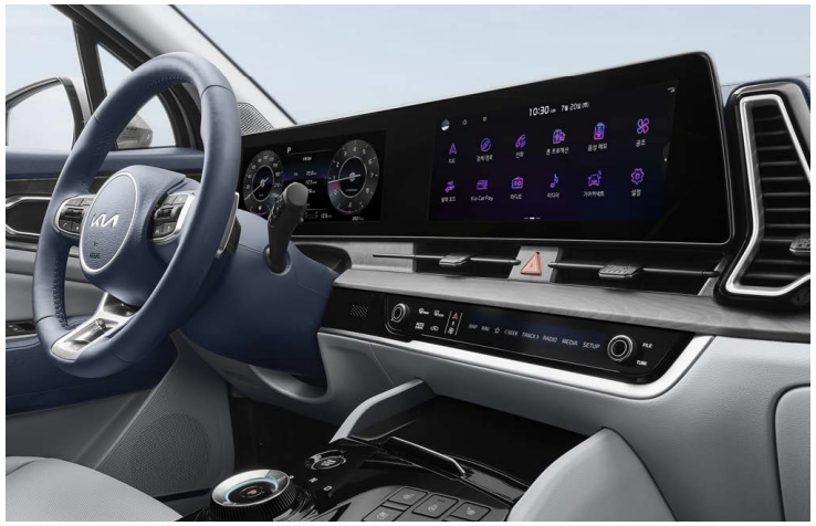 스포티지의 내부를 먼저 보면 12.3 인치 와이드 디스플레이어 장착으로 지도 및 차량 정보를 한눈에 볼 수 있도록 합니다. 또한 전자식 변속 다이얼을 통해 변속기를 작동하여 편리함과 고급감을 동시에 제공합니다.