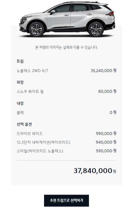 기아 홈페이지에서스포티지를 검색하는 도중 '혹시 옵션의 고민이 있나요'라는 창이 뜨면서 인기 트림과 옵션을 선택해 주었습니다. 이를 통해서 나만의 스포티지를 만들 수 있었는데요. 추천 스포티지 트림과 옵션은 노블레스 2WD A/T, 스노 펄, 드라이브 와이즈, 12.3 인치 내비게이션, 스타일 등을 추가하는 옵션이었습니다.