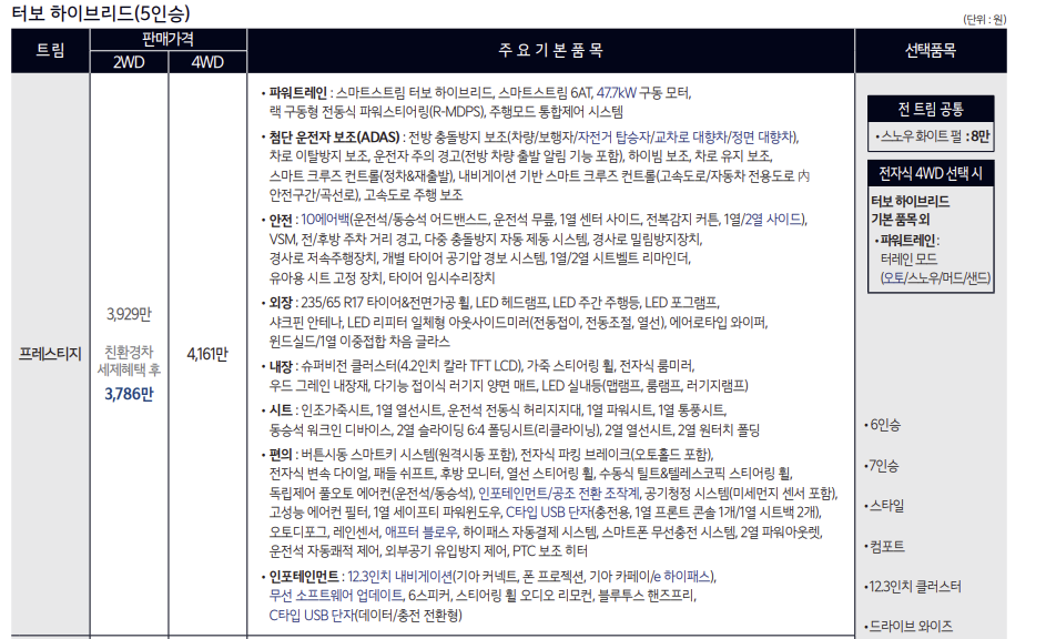 사륜구동 (4WD) 선택 시 4,161만 원이며 친환경 세제혜택이 적용되지 않습니다. 리터당 주행거리의 기준을 아슬하게 맞추다 보니 이런 애매한 기준이 생겨났네요.
