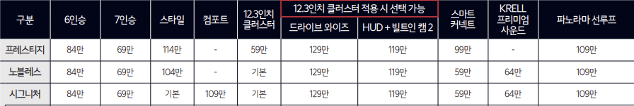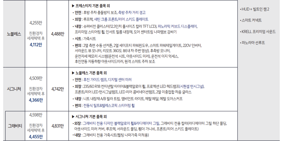 가성비를 원한다면 프레스티지 보다 노블레스를 추천합니다. 프레스티지와 노블레스의 차이는 326만 원 차이지만 차이가 너무 많이 납니다.