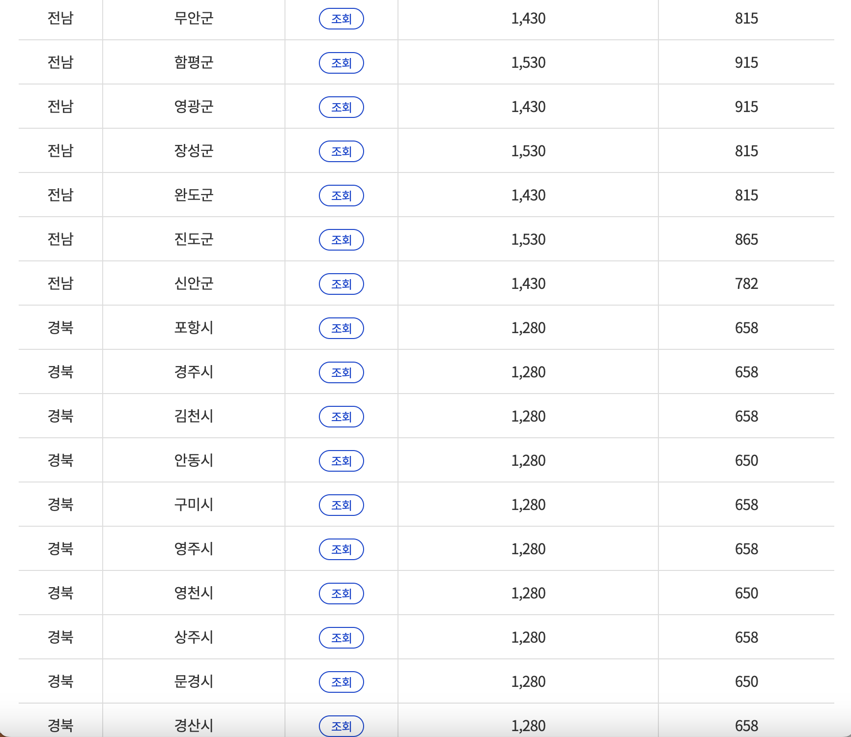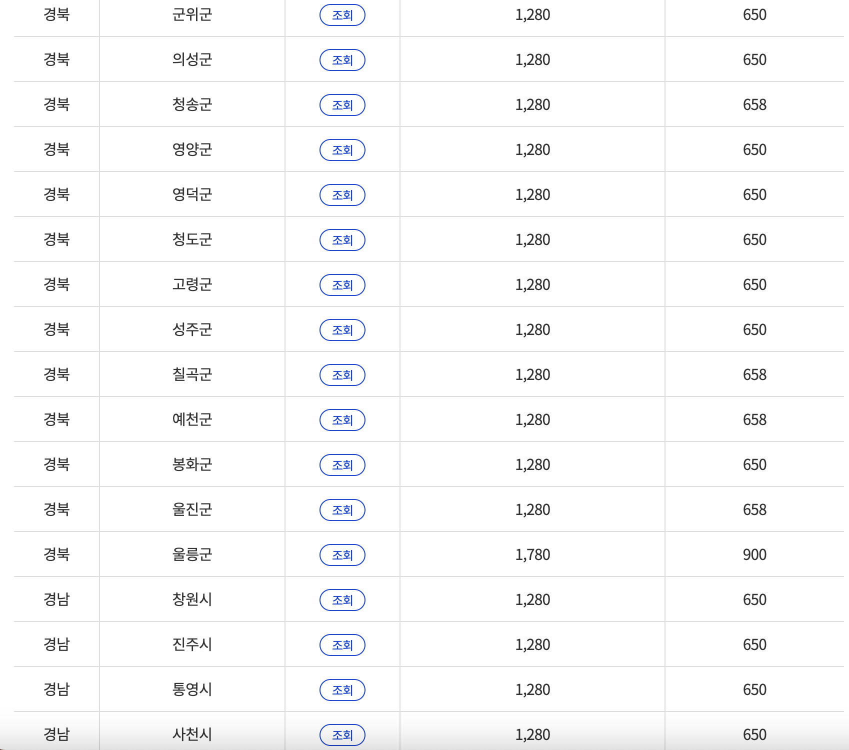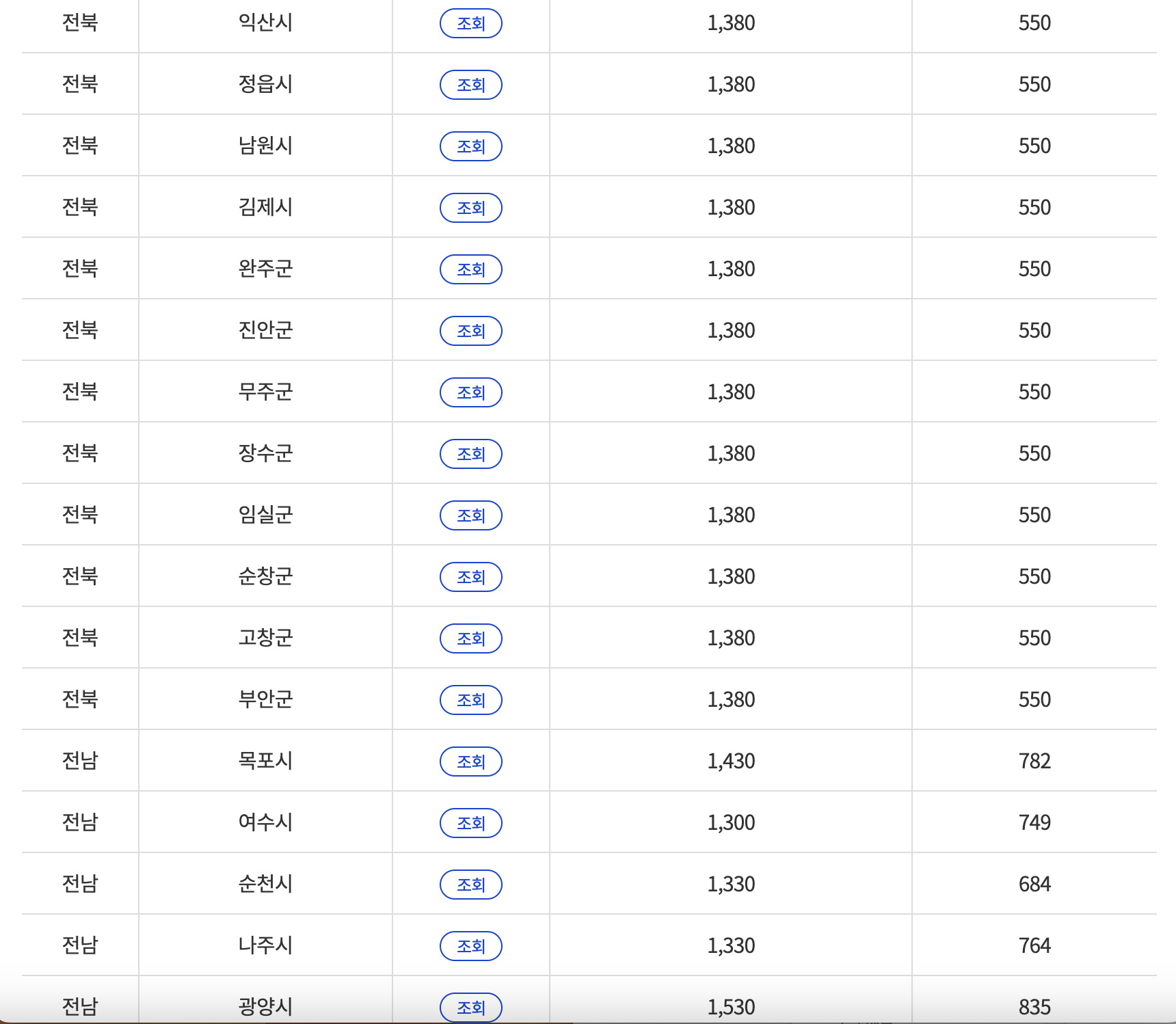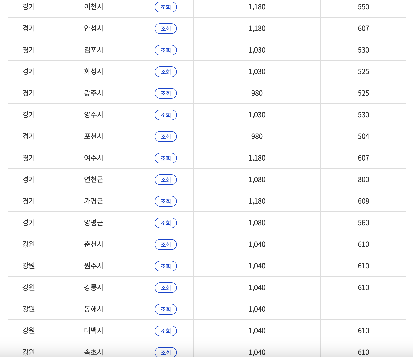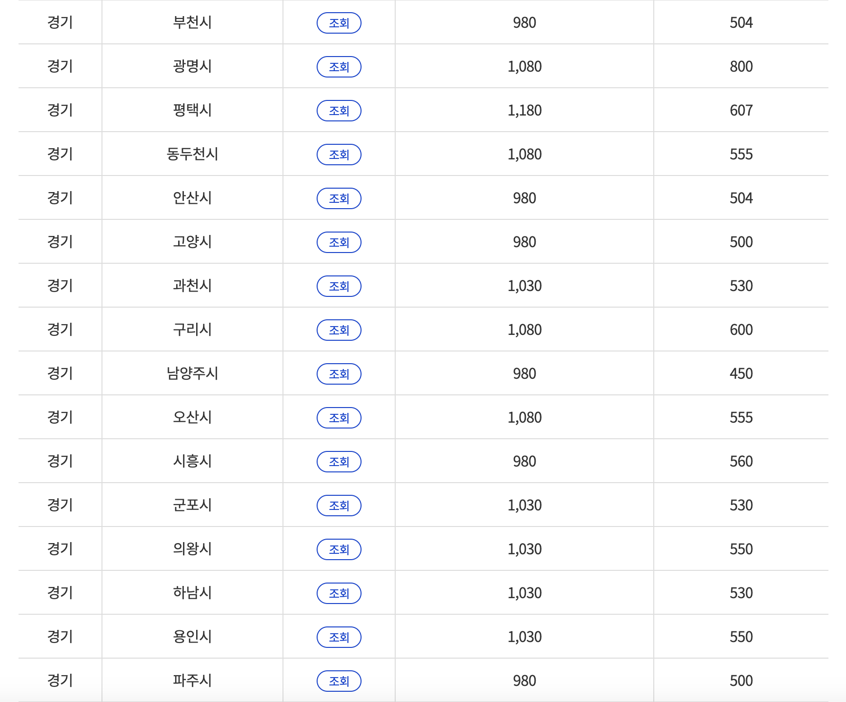 경기지역 수원, 성남, 의정부, 안양까지 위의 표에 포함됩니다.