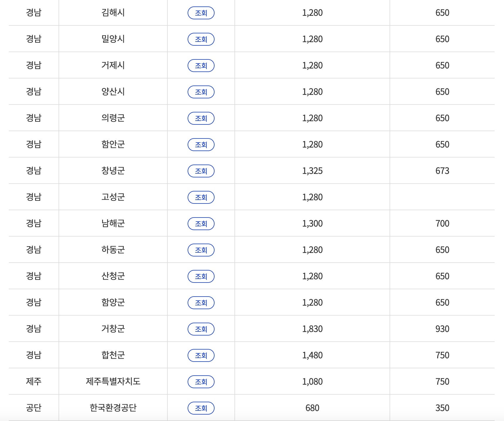 서울특별시, 부산광역시, 대구광역시, 인천광역시, 광주광역시, 대전광역시, 울산광역시, 세종특별자치시는 위의 표를 참고 바랍니다.