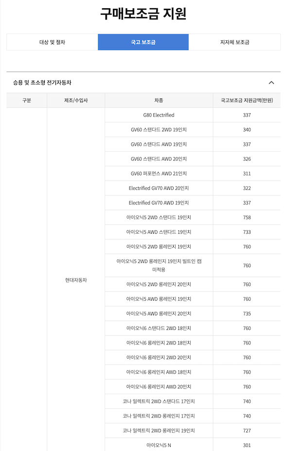 현대자동차 GV60, GV70, 아이오닉 5, 아이오닉 6, 코나 일렉트릭의 기종에서 보조금을 지원합니다. 최소 311~최대 760만 원의 차량 국고 지원금이 지급됩니다.
