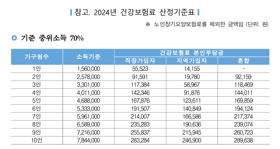 아래글을 통해 가구원에 따른 건강보험료 산정기준표에 따른 중위소득을 확인 할 수 있습니다.