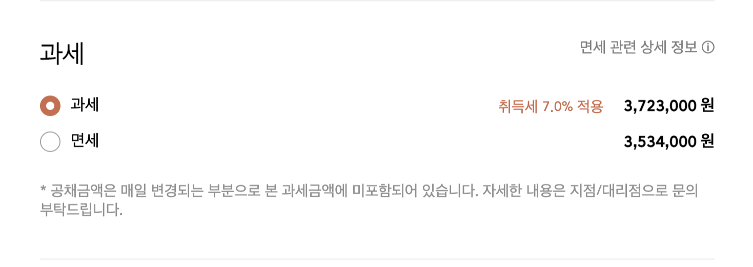 세금은 위의 옵션을 추가로 한 차량금액 5851만 원의 7% 인 372만원입니다.