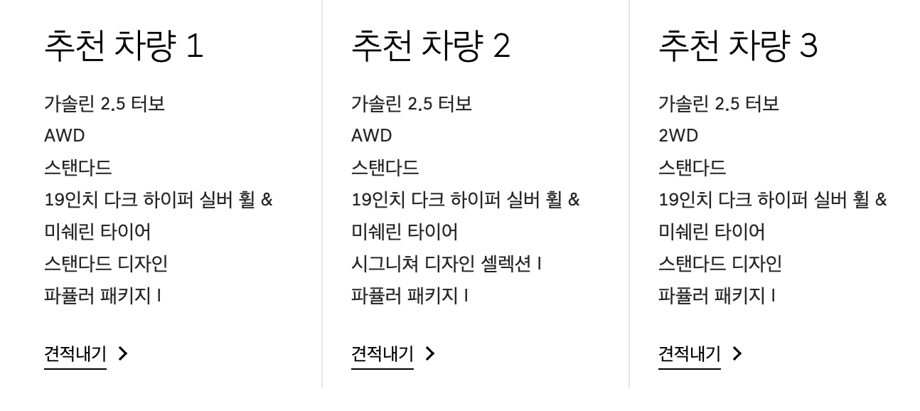 다양한 옵션으로 어떤 옵션을 선택해야 할 지 고민이 되시는 분들을 위해 제네시스 홈페이지에 추천차량 3 대를 올려 놓아서, 저도 이대로 차량의 견적을 내볼려고 합니다. 추천차량 1,2,3의 차이는 디자인 인것 같은데 추천차량 1,3의 차이 위의 표의 설명 상 같아 보여서 무난한 추천차량 1번으로 견적을 냈습니다.