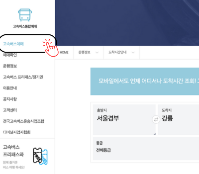 1️⃣ 고속버스통합예매사이트 좌측 [고속버스예매]를 클릭합니다. 단 버스표가 매진될 시에는 예매가 불가하니 미리 예매하시길 바랍니다.