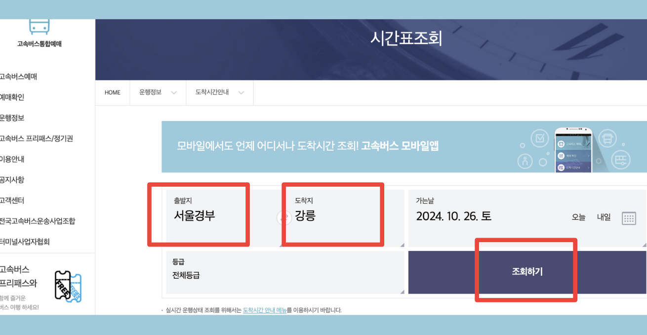 2️⃣ 출발지, 도착지, 가는날을 선택한 후 [조회하기 버튼을 클릭합니다.