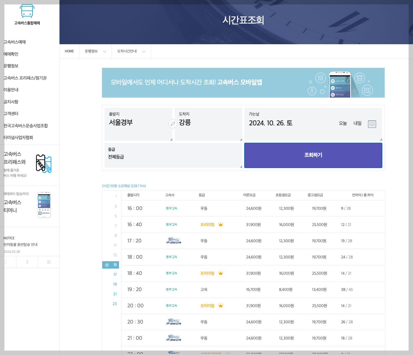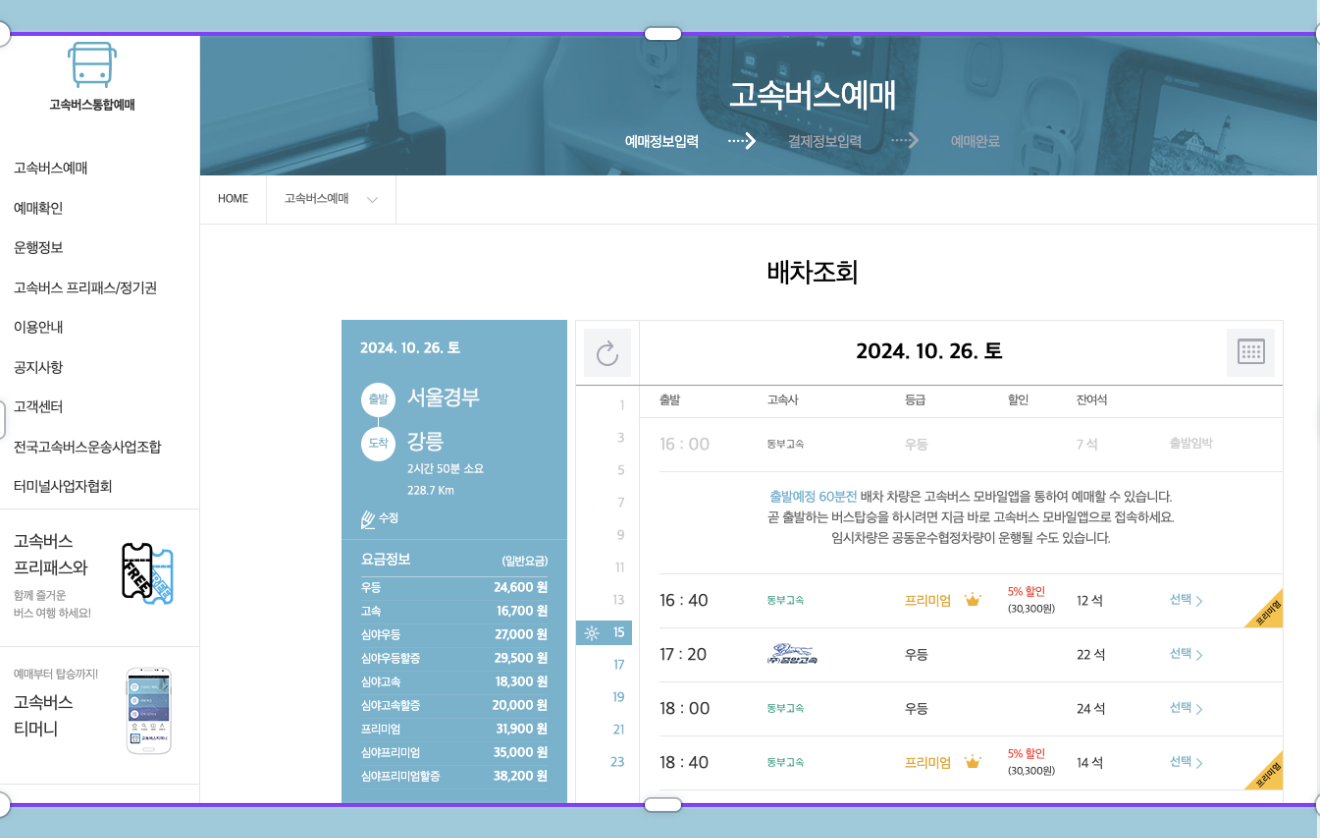 4️⃣ 고속버스 시간 및 가격, 잔여 좌석을 한눈에 볼 수 있습니다