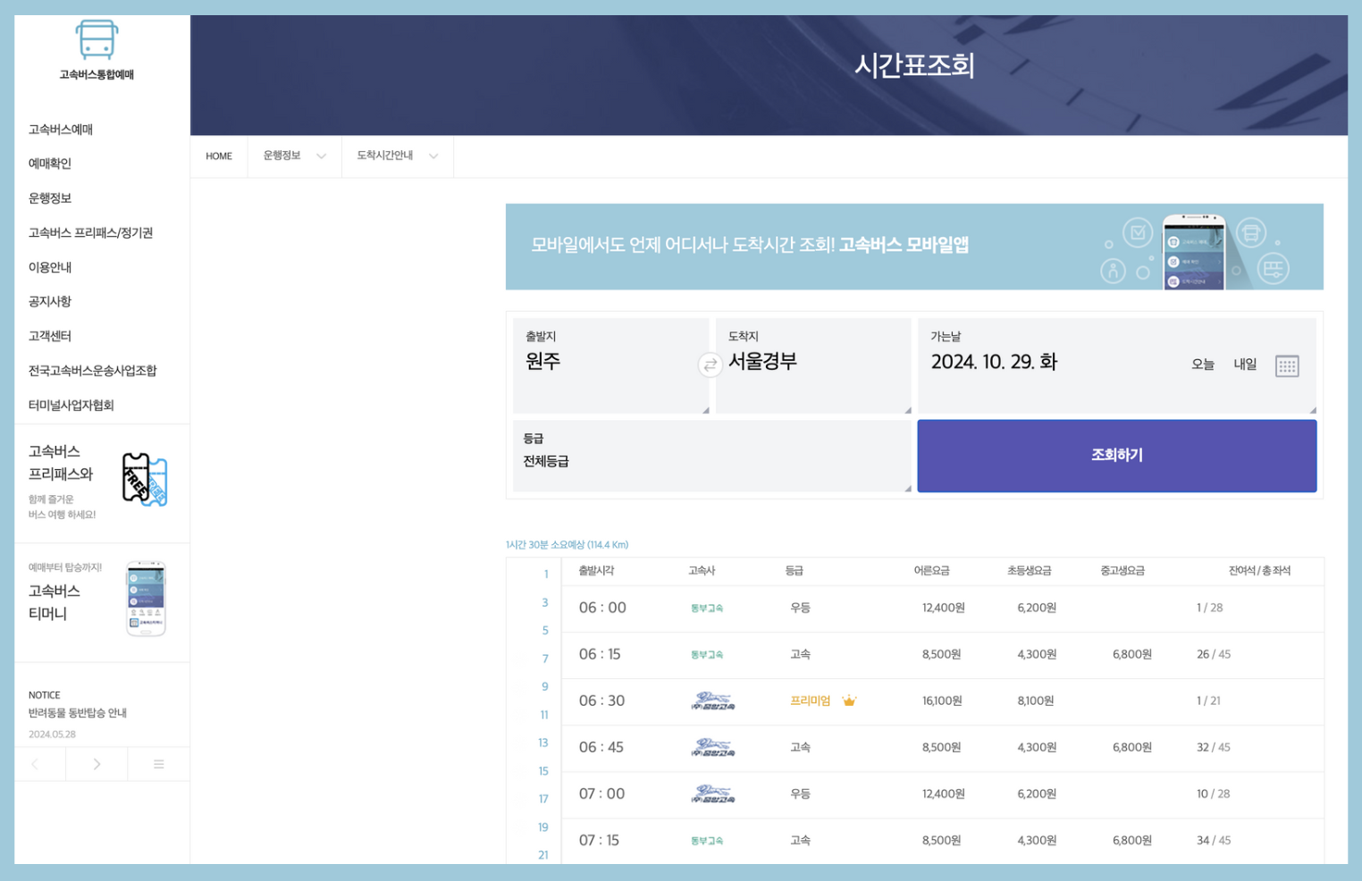 4️⃣ 고속버스 시간 및 가격, 잔여 좌석을 한눈에 볼 수 있습니다