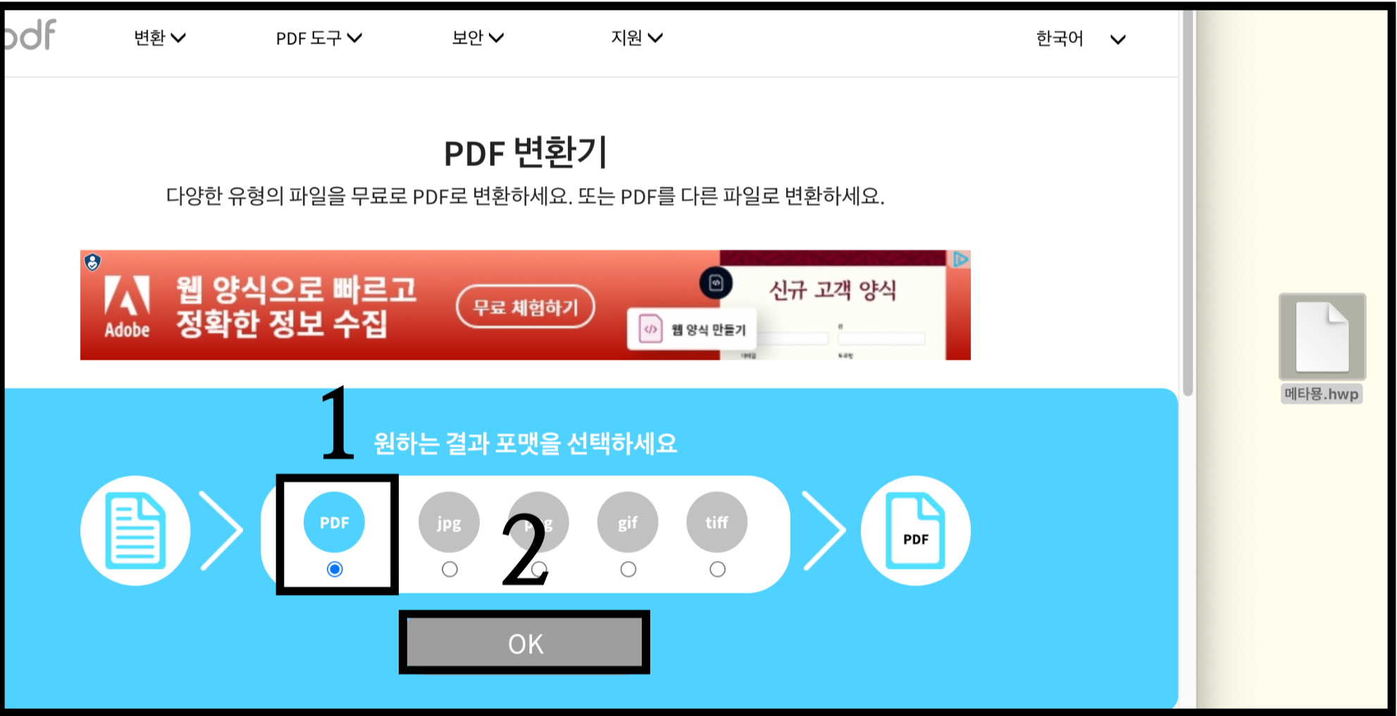 PDF, JPG, PNG 등의 파일변환 중에 PDF를 선택한 후 OK 버튼을 누릅니다.