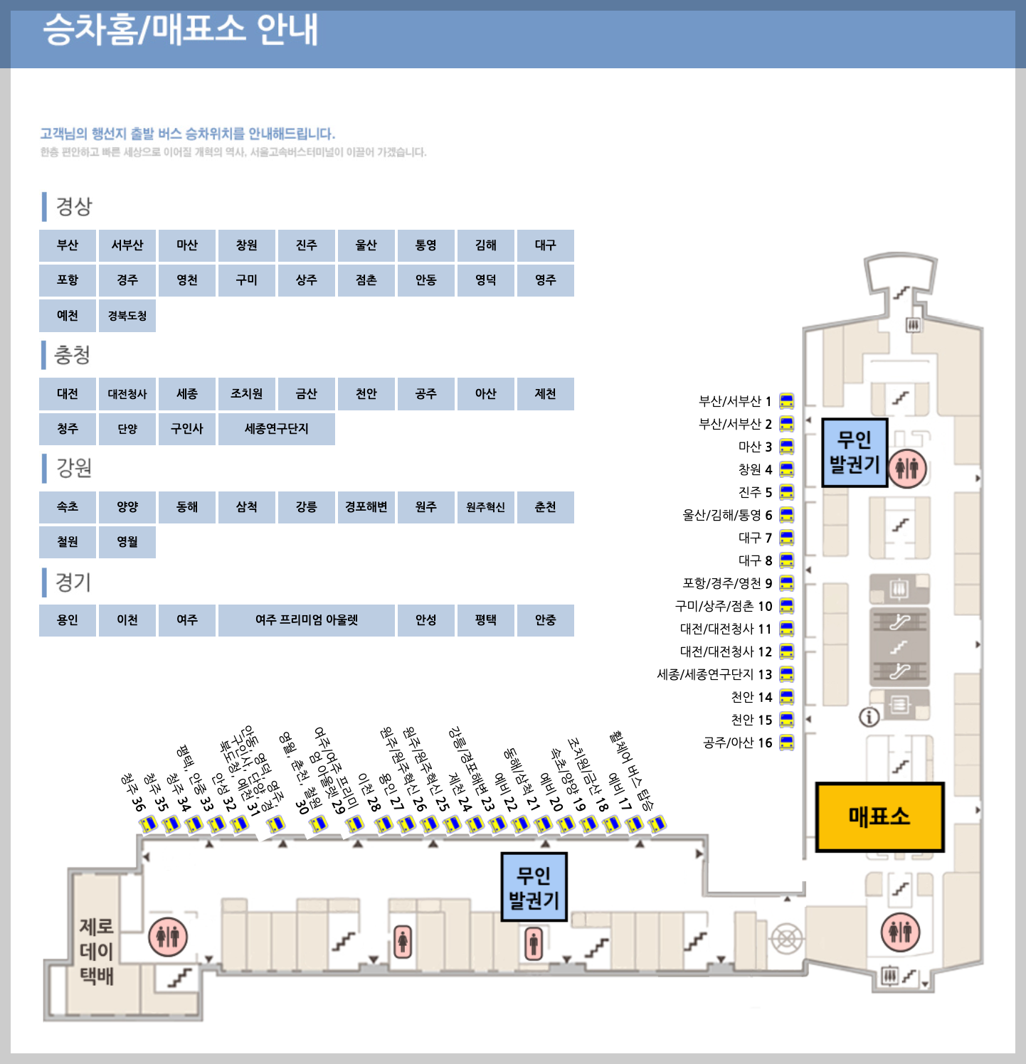 서울 고속버스 홈페이지에서는 층별 안내 및 승차홈, 매표소, 무인발권기, 택배 위치 등을 알 수 있습니다.