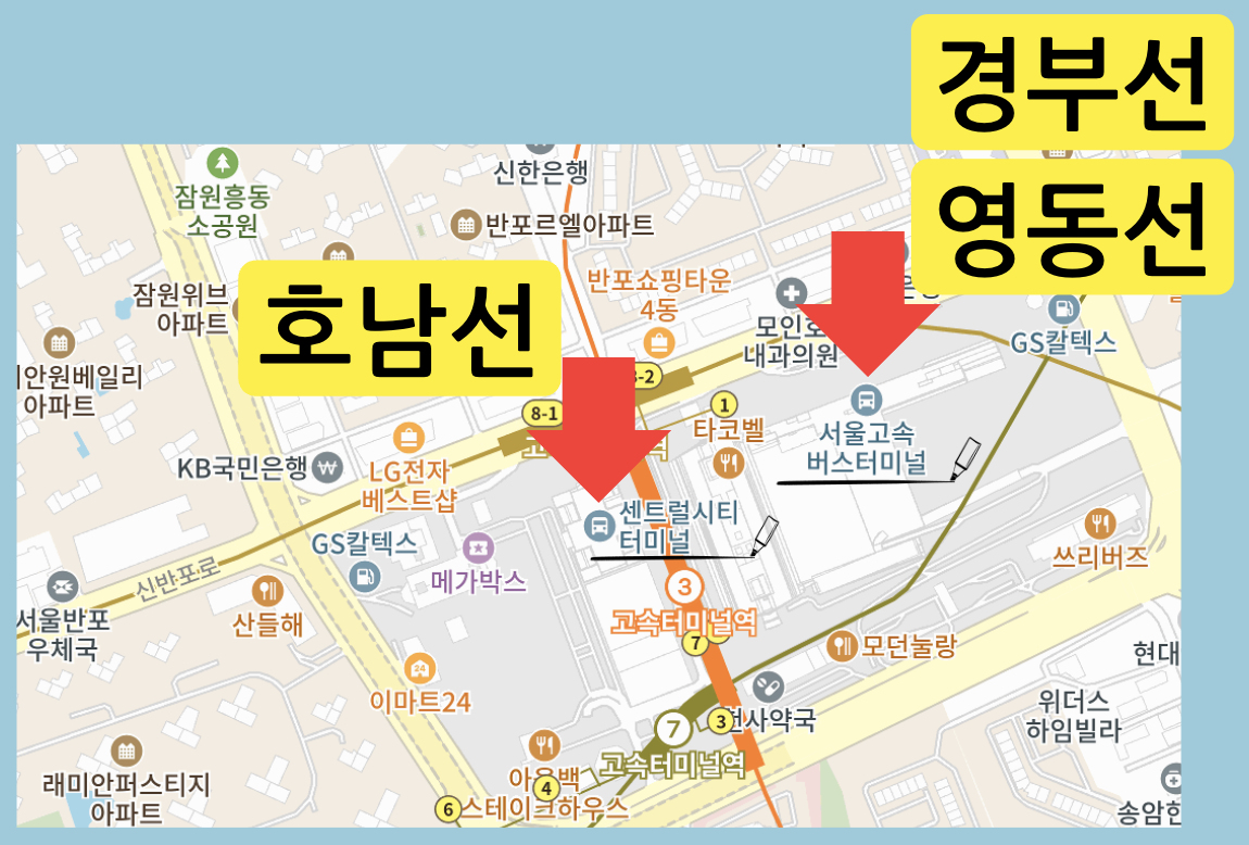 고속터미널역에서 내린 후 두 곳의 고속버스 타는 곳이 있습니다. 서울고속버스 터미널은 경부선 영동선 탑승이 가능합니다. 센트럴시티 터미널은 호남선 탑승하는 곳이니 혼동 하지않도록 주의하시길 바랍니다.