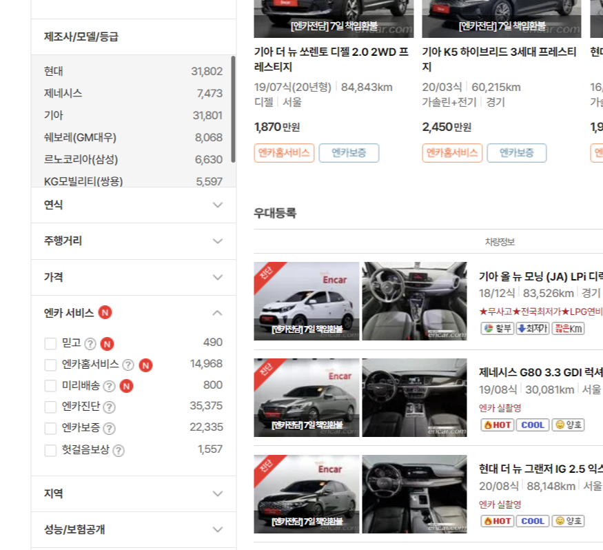 좌측 검색창을 봅니다. 차종, 제조사/모델/등급, 연식, 주행거리, 가격, 엔카 서비스, 지역 등을 선택하여 고를 수 있습니다.