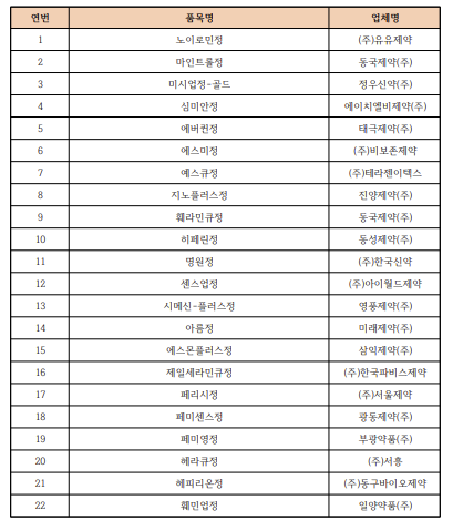 이 리스트는 특정 약물 또는 제품에 대한 정보를 제공하고 있으며, 각각의 제품이 어떤 제약사에 의해 제조되는지를 나타내고 있습니다.