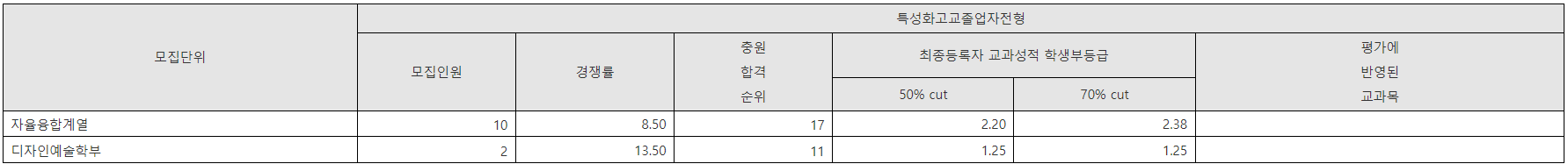 자율융합계열 모집 인원은 246명이며, 경쟁률은 2.95:1입니다. 총원 합격 순위는 51위이며, 최종 등록자의 50% 컷 환산점수는 71.43점, 70% 컷 환산점수는 65.50점입니다. 교과 성적의 학생부 등급은 50% 컷에서 4.35, 70% 컷에서 4.68입니다.