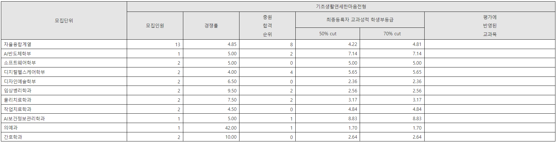 디지털헬스케어학부는 15명을 모집하며, 경쟁률은 3.73:1입니다. 총원 합격 순위는 6위로 나타났습니다. 최종 등록자의 50% 컷 환산점수는 73.74점, 70% 컷 환산점수는 64.15점이며, 학생부 등급은 50% 컷에서 3.99, 70% 컷에서 4.56입니다.